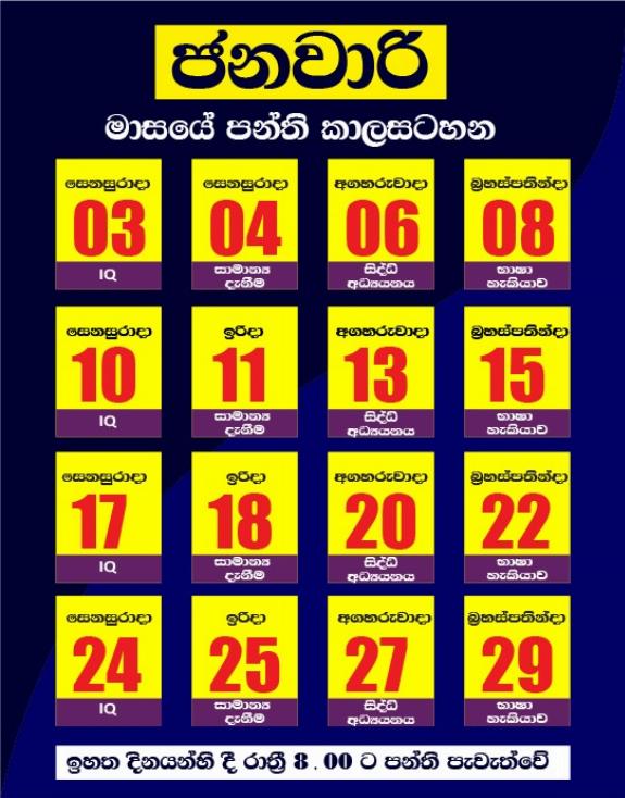 ශ්‍රී ලංකා විදුහල්පති සේවයේ III  ශ්‍රේණියට බඳවා ගැනීමේ සීමිත තරග විභාගය. සියලුම පන්තිවල Recordings විභාගය දක්වාම අපගේ වෙබ් අඩවිය ඔස්සේ ඕනෑම වාරයක් නැරඹීමේ හැකියාව ඇත. විෂයන් හතර ප්‍රවීන ගුරුවරු හතර දෙනෙකු මඟින් ආවරණය කරනු ලබයි. විෂය නිර්දේශයට අදාළ සියලු සිද්ධාන්ත ආවරණය කරමින් විභාග ආකෘති ප්‍රශ්න පත්‍ර, පසුගිය විභාග ප්‍රශ්න පත්‍ර සාකච්චා කිරීම මෙම පාඨමාලාවේ දී සිදු කෙරේ.පහත දිනයන්හි සවස 7.30 ට පන්ති පැවත්වේ.